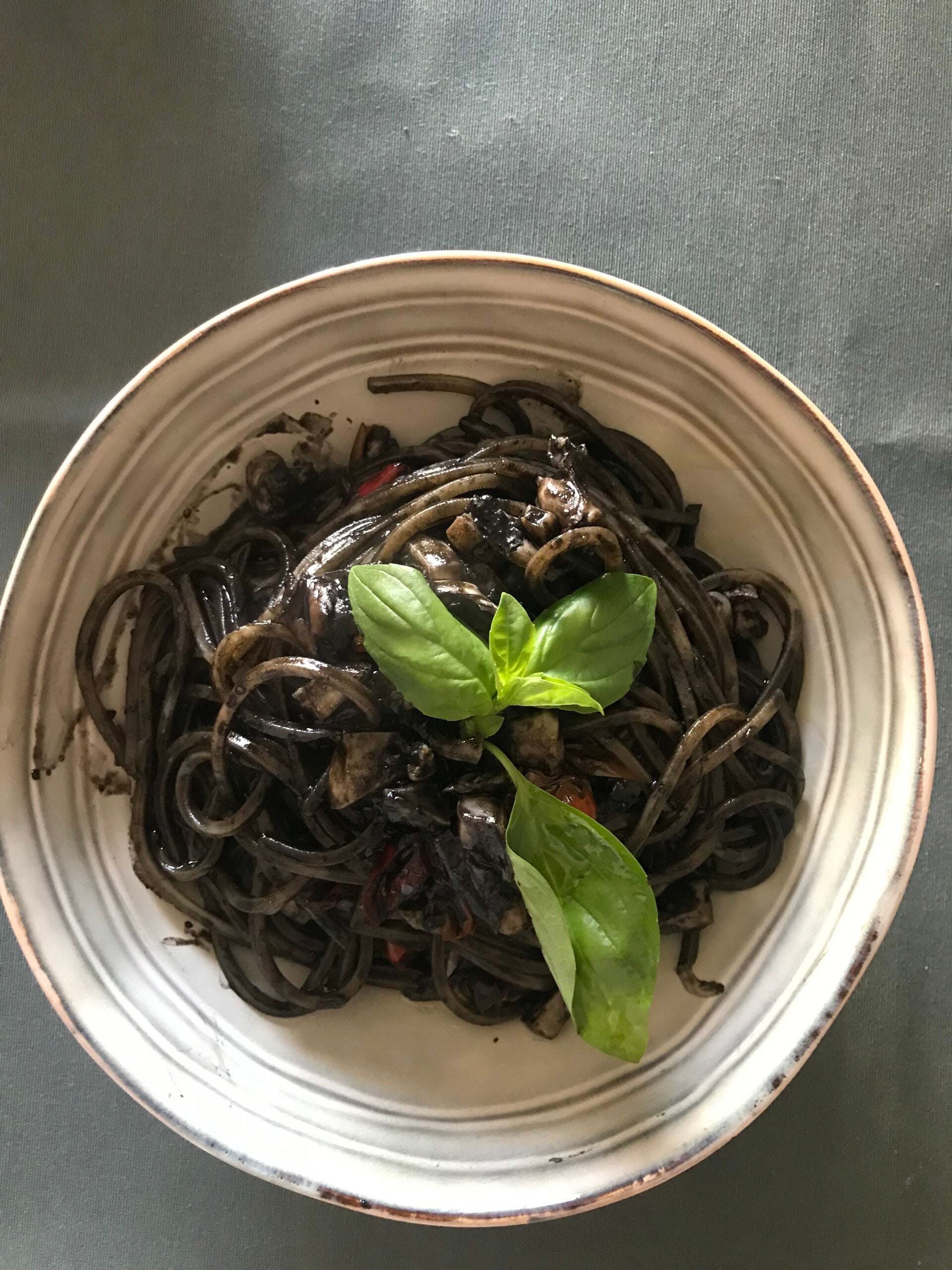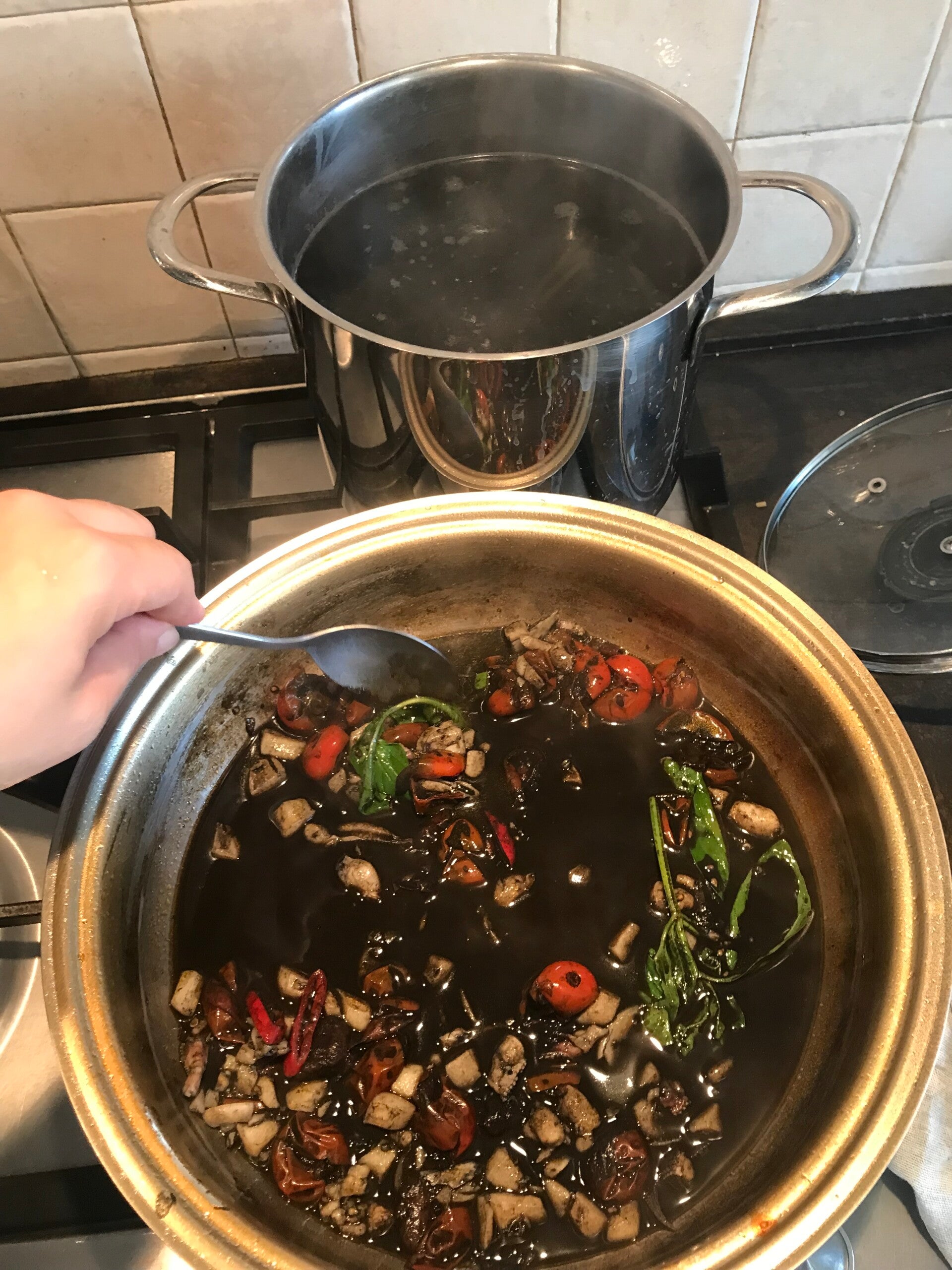 Intanto l'acqua bolle , la salo con un cucchiaio non troppo colmo di sale grosso, butto la pasta, (io ho utilizzato gli spaghetti alla chitarra 12 minuti di cottura), intanto il sughino è quasi pronto, a questo punto ci butto dentro il nero di seppia, e le foglie fresche di basilico e continuo a cuocere un paio di minutini. Scolo la pasta all' 11 esimo minuto e la verso nel tegame con il nero di seppia, mescolando molto molto bene il tutto , possibilmente facendo saltare gli spaghetti , solo cosi gli ingredienti si potranno veramente amalgamare bene ,inizialmente sembrerà che il nero non attecchisce facendo sembrare lo spaghetto un pò pallido, ma dovete pazientare e mescolare ancora,