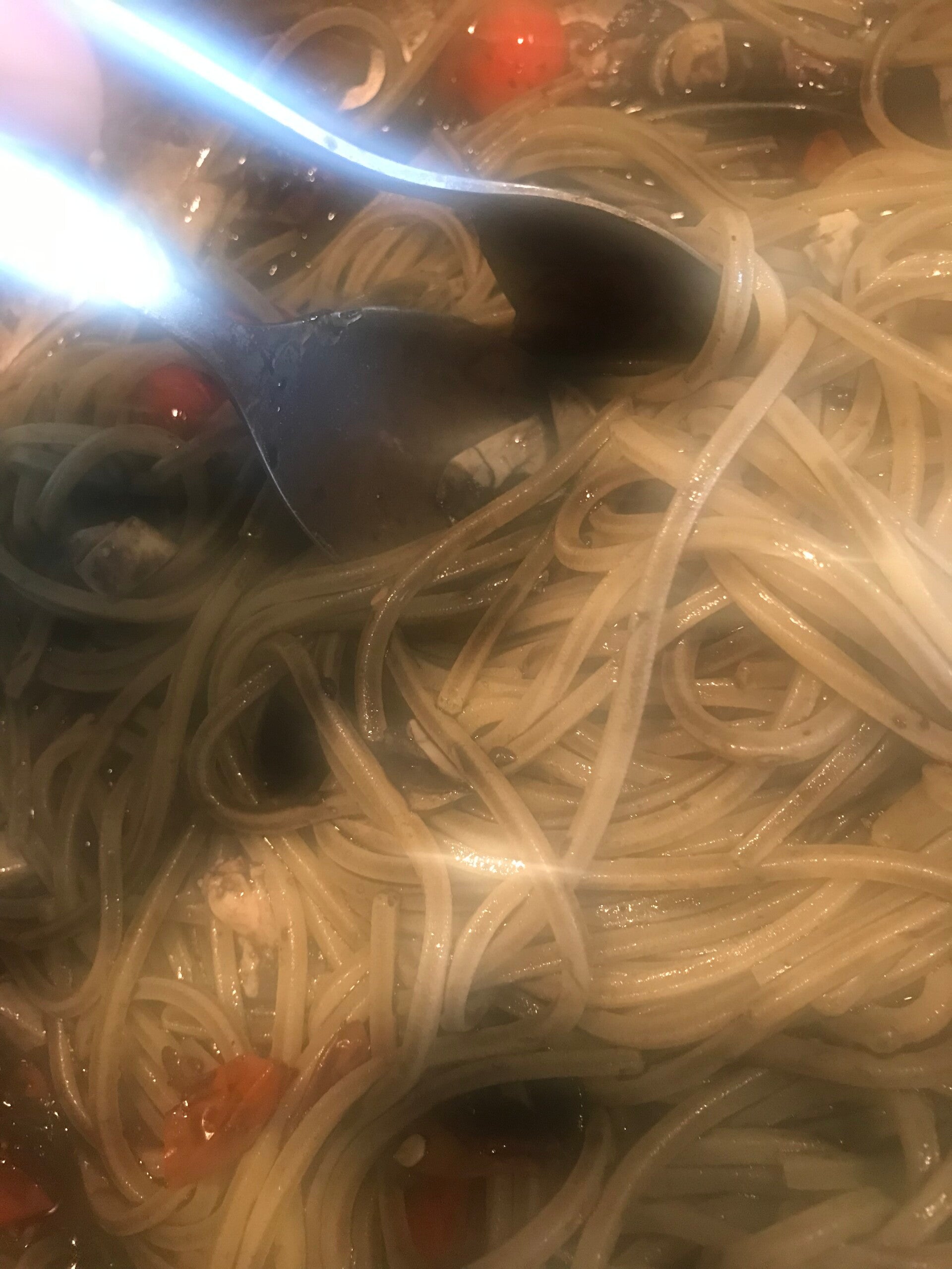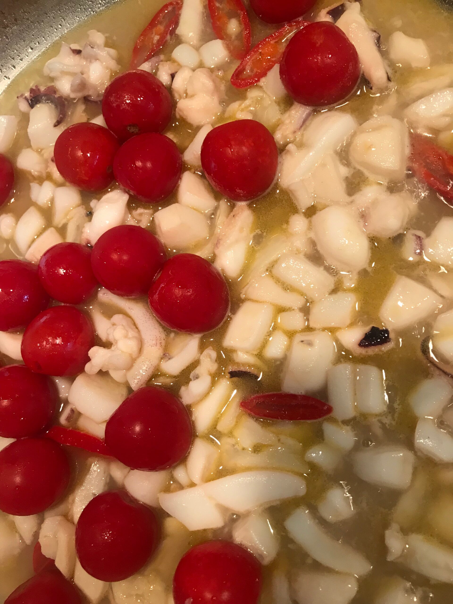 Dopo qualche minutino che sta sfrugugliando insieme all'aglio peperoncino e gambo di prezzemolo verso un mezzo bicchiere di vino bianco , alzo poco la fiamma e faccio sfumare qualche minutino, poi quando vedo che il vino è evaporato verso i pomodorini o la salsa di pomodoro , e ci aggiungo un bicchiere di acqua bollente (quella che stiamo scaldando per cuocere la pasta va benissimo ). Attendo una decina di minuti a fuoco medio basso e