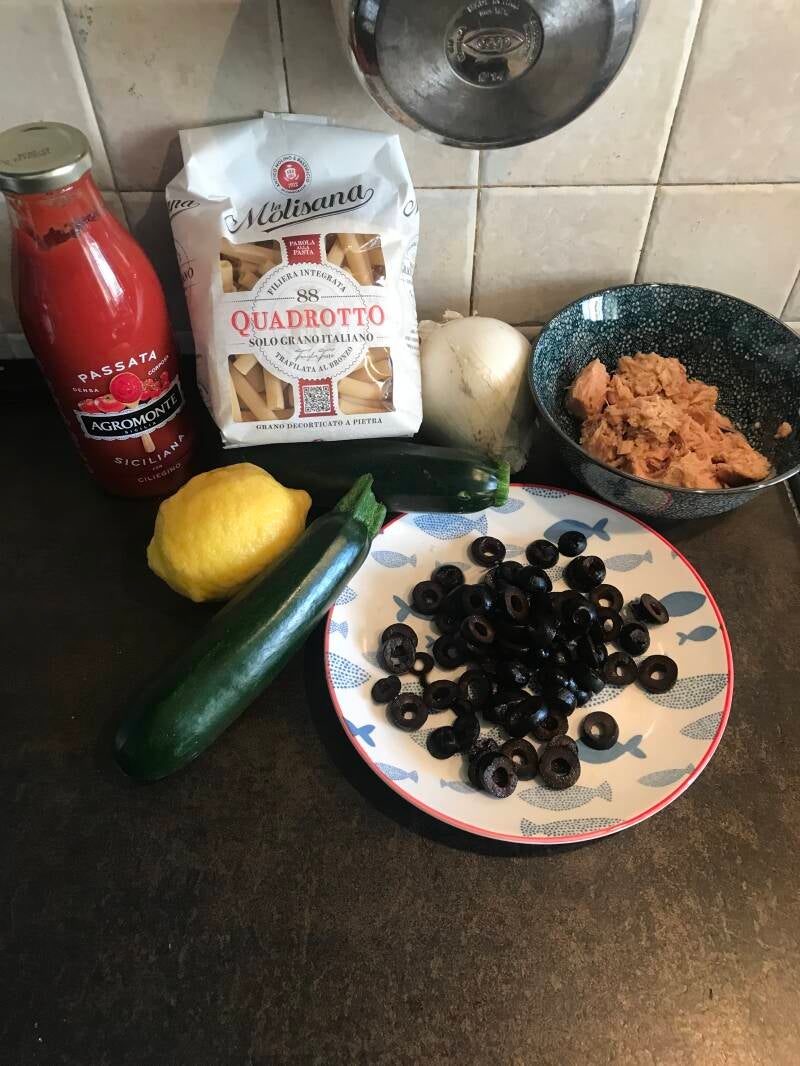Dopo 10 minuti il sugo di pomodoro è più che cotto, quindi aggiungo le olive ,il tonno , e le zucchine che avevo cotto a parte, mescolo per un minuto e spengo la fiamma.