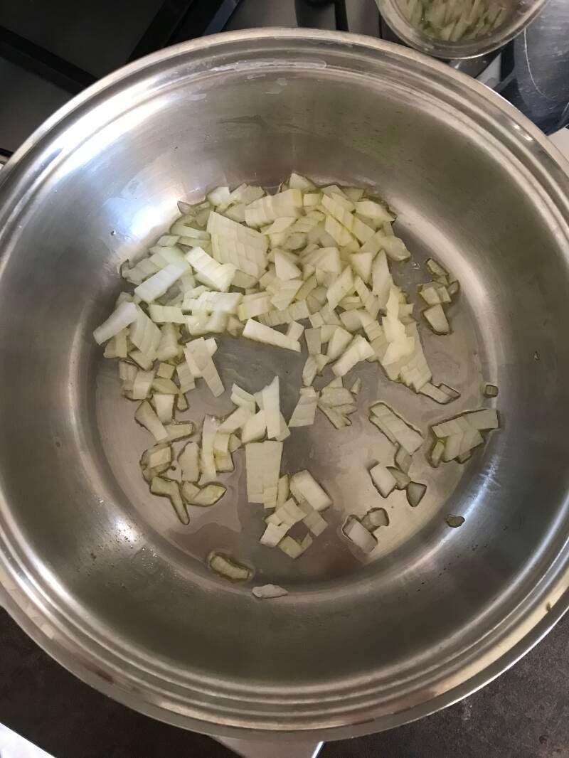 taglio una mezza cipolla a pezzettini piccolini e la verso a soffriggere in un tegame con un cucchiaio di olio extra vergine di oliva, il tutto a fuoco molto basso.